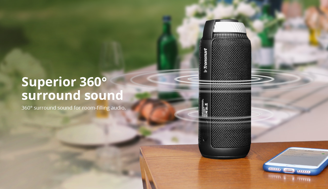 Портативна аудіо колонка відтворює музику як при поєднанні з мобільними гаджетами через мережу Bluetooth, так і за допомогою проводового AUX-підключення. На озброєння моделі поставлена пара різноспрямованих динаміків сумарною потужністю 25 Вт, що забезпечують поширення звуку в межах 360 °, а на додаток їм надано пасивний випромінювач (у нижній частині корпусу). Органи керування Tronsmart Element T6 (кнопки перемикання треків та встановлення відтворення на паузу в обрамленні сріблястого кільця регулювання гучності) зосереджені на верхньому торці. По периметру «приладка» підсвічується кольоровою індикацією: миготливим синім при готовності до підключення, синім, що світиться при активному поєднанні, червоним під час зарядки і зеленим при повних баках батареї. Акумулятор, до речі, має ємність 5200 мАг, чого, як запевняє виробник, вистачає на 15-годинний марафон безперервного програвання треків. Насправді за середньої гучності відтворення музики колонка попроситься на зарядку після закінчення 10-12 годин роботи. Портативна акустика Tronsmart Element T6 – ідеальний компаньйон для пікніків, зустрічей з друзями, поїздок.
