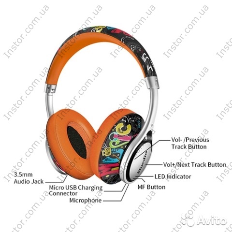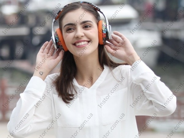 Як зрозуміло, дизайн-це основна особливість даних блютуз навушників. Існує 2 яскраві та барвисті забарвлення, які безсумнівно припадуть до смаку як жіночій, так і чоловічій підлозі і без сумнівів, чудово допоможуть доповнити імідж. Чашечки виконані із софт-тач пластику, з перегукуються по малюнку із зовнішньою стороною оголов'я блютуз навушників, це виглядає доцільно та стильно. Амбушюри щільно, але при цьому ніжно прилягають до вух, виконані з дуже м'якого шкіри, по колірній гамі ідентичні, нижній стороні оголов'я. При тривалому прослуховуванні голова абсолютно не втомлюється. Обід та кріплення обода до чашок виконані з матового авіаційного алюмінію, що поєднує в собі легкість та міцність одночасно. Механізм складання чашок надійний, розрахований на понад 30 тисяч згинань. Бездротові навушники компактні і важать лише 215 грам.