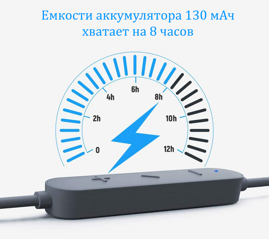 Тривалий термін служби акумулятора. До 8 години прослуховування музики на одному заряді