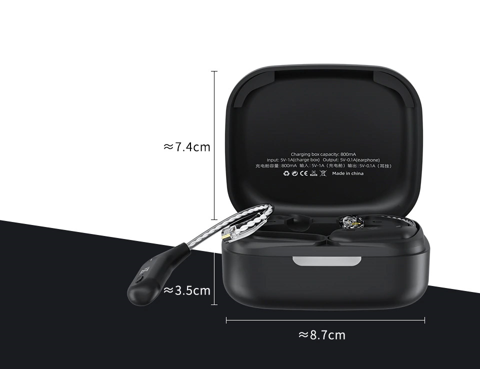 Чувствительность: 120±3dB. Кейс с размерами 8,7x7,4x3,5 см. Комплектация: 2 Bluetooth-заушины, зарядный кейс, кабель USB A - USB Type-C, инструкция.