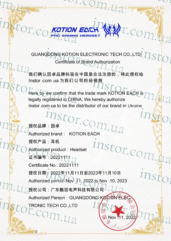 Instor є авторизованим дистриб'ютором продукції Kotion Each в Україні. Ми отримали відповідний сертифікат, який підтверджує право на офіційне представлення цієї продукції від імені виробника