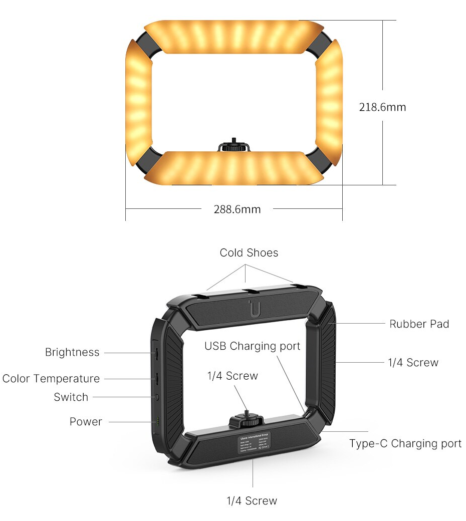 Багатофункціональна кільцева лампа U200 від Ulanzi підходить для відеоблогів, інтерв'ю, TikTok, YouTube, відеодзвінків та багато іншого. Ви можете легко налаштувати колірну температуру та яскравість. Кільцеву лампу можна використовувати як підставку, але ви також можете закріпити ULANZI U200 на штативі або столі. З 3 кріпленнями для холодного черевика ви можете підключити всі улюблені аксесуари. На додачу, кільцева лампа також є зовнішнім акумулятором, за допомогою якого ви можете заряджати свій телефон або камеру під час використання.