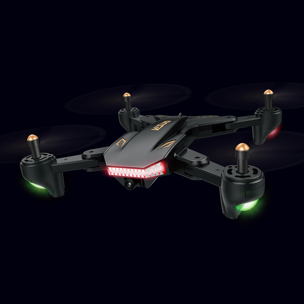 Visuo XS809S відрізняється компактним дизайном і важить всього 160 грам, тому його дуже легко носити з собою. У розкладеному стані він має розміри 32.5*32.5*6 см. У складеному вигляді він розміром зі смартфоном, який можна покласти в кишеню або сумку. Чорне покриття корпусу і надає йому стильного вигляду. Передня частина оснащена вбудованим червоним світлодіодом із дизайном, що нагадує зуби акули.