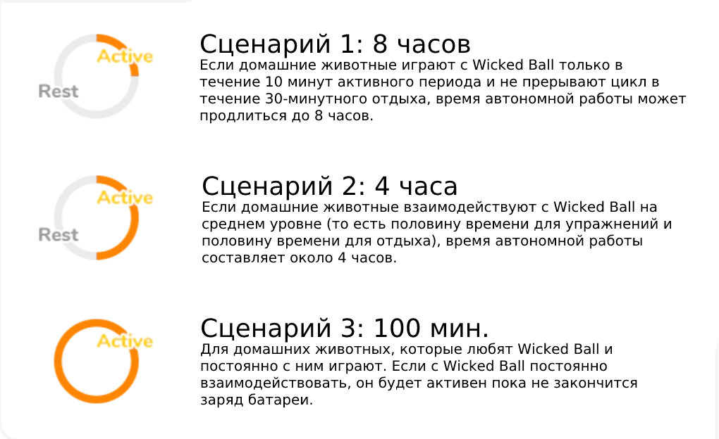Час гри залежить від часу взаємодії Wicked Ball та вихованців, а також встановленого режиму. Максимальний час роботи – до 8 годин.