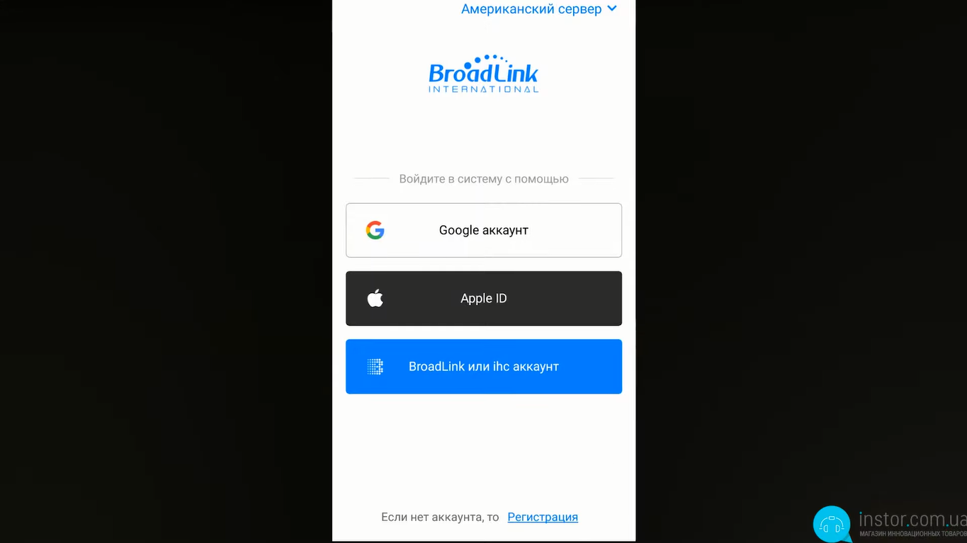 Підключається лампочка у стандартний тип цоколя - Е27, тому пристрій можна застосовувати як і в люстрах, так і в настільних лампах. Після того, як ви подасте струм на лампочку - вона почне блимати. Це говорить про те, що лампа знаходиться в режимі пошуку і її можна підключити до смартфону. Для цього завантажуємо програму Broadlink – вводимо всі необхідні дані та обов'язково реєструємось, вибираємо сервер – у нашому випадку це американський сервер. Це потрібно для того, щоб на сервері зберігалися дані про ваші пристрої та сценарії їх роботи.