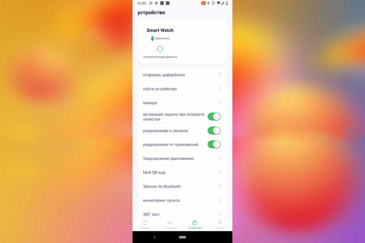 Далі можна включити пошук годинника, зробити віддалений знімок зі смартфона - натиснувши на цей пункт запуститься камера, а на годиннику з'явиться кнопка натиснувши на яку буде зроблено фото. Далі - можливість активації дисплея при повороті зап'ястя, увімкнення сповіщення про дзвінки та з програм. Налаштування дзвінків по блютуз - для цього годинник потрібно підключити як окремий пристрій у налаштуваннях вашого смартфона. Налаштувати постійний моніторинг пульсу – а саме вказати час вимірювання та його частоту – від 1 разів на 10 хвилин і до 1 разу на годину.
