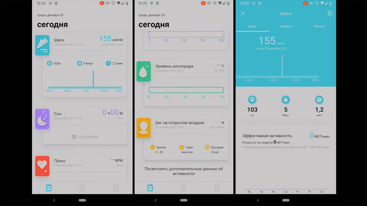 На головному екрані годинник дозволяє швидко ознайомитися зі спортивною статистикою за день - для цього свайпаем вліво і бачимо дані про пройдену відстань, сон, спалені калорії, пульс, тиск і кисню в крові. А також погоду зробити віддалений знімок камерою, керувати плеєром пристрою і включити дихальні вправи.