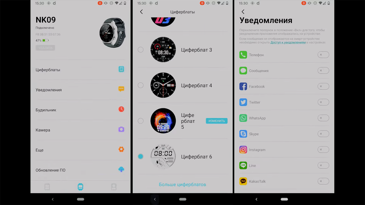 На другій сторінці основні налаштування годинника. Можна вибрати циферблати, вибрати звідки будуть надходити повідомлення, виставити будильник, увімкнути віддалене керування камерою пристрою. У розділі "Ще" можна поміняти формат часу, включити режим "не турбувати", нагадування про рух, поміняти мову браслета, включити постійний моніторинг пульсу - ця опція може скоротити час використання пристрою та багато іншого.