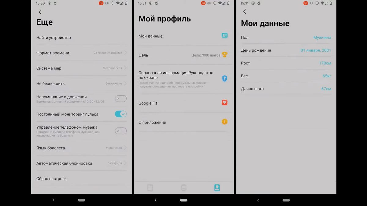 В останньому пункті - налаштування вашого профілю для коректної роботи пристрою потрібно обов'язково коректно вказати зріст, вагу та вік.