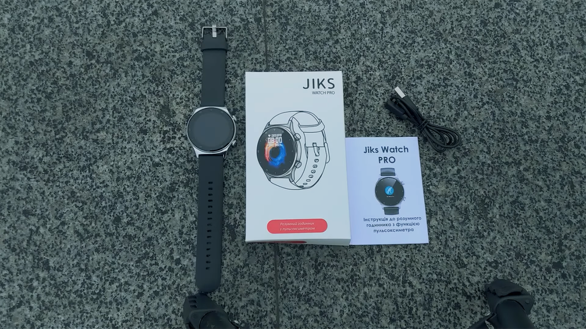 Jiks Watch Pro - це смарт годинник у класичному стилі. Поставляються вони в невеликій білій коробці всередині якої знаходяться самі годинники, магнітний зарядний кабель та інструкція українською мовою.