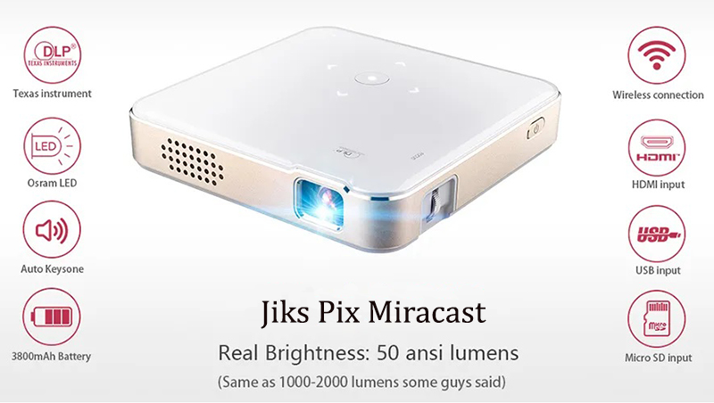 Портативний відеопроектор Jiks Pix Miracast – чудове рішення для людей, які бажають переглядати контент у будь-якому зручному місці. Ви можете легко підключити телефон, комп'ютер або ТВ-бокс через HDMI або USB-порт. Міні-проектор для домашнього кінотеатру можна брати з собою в подорож або у відпустку завдяки компактності та 2 годинам автономної роботи. Він надає різноманітність підключень, у тому числі і по Wi-Fi та Bluetooth, що дає вам більші можливості перегляду. Крім того, він має непогану роздільну здатність 640×360 пікселів (формат сумісний з 1080P) і аудіовиходом. Все це робить портативний відеопроектор Jiks Pix Miracast ідеальним пристроєм для проектування будинку, в офісі або навіть у гостях у друзів. Вибирайте портативний проектор Jiks Pix Miracast для перегляду контенту будь-де!