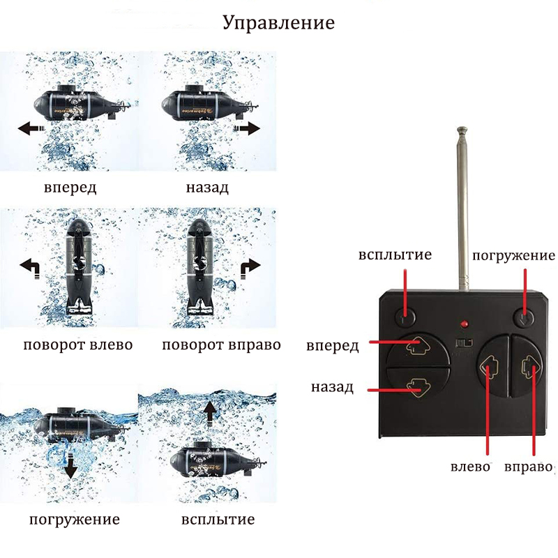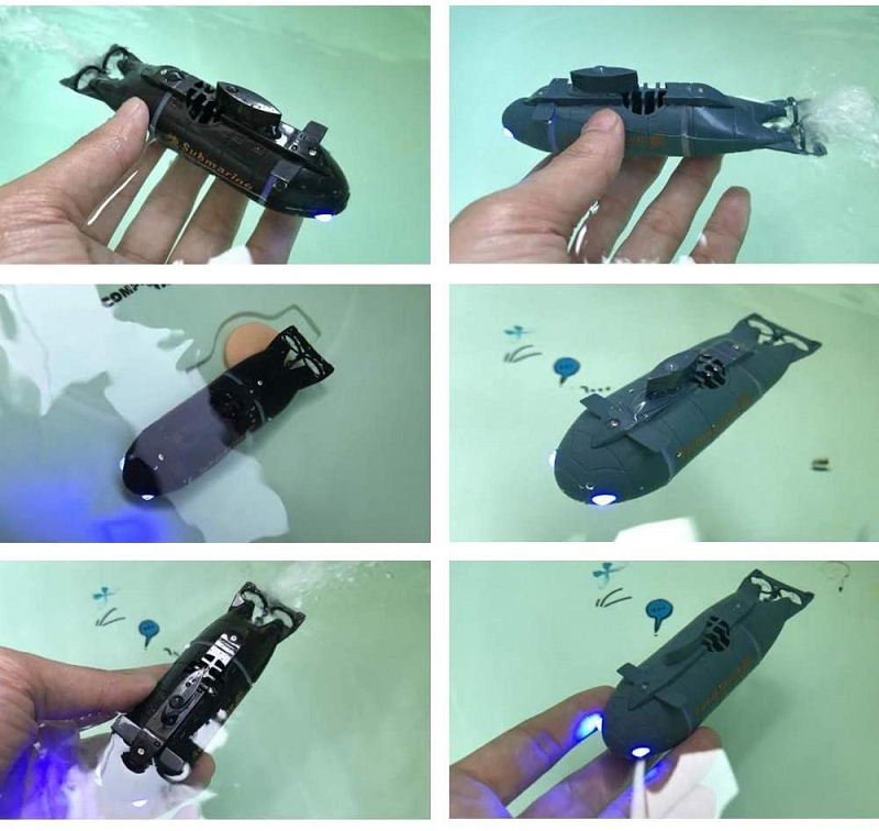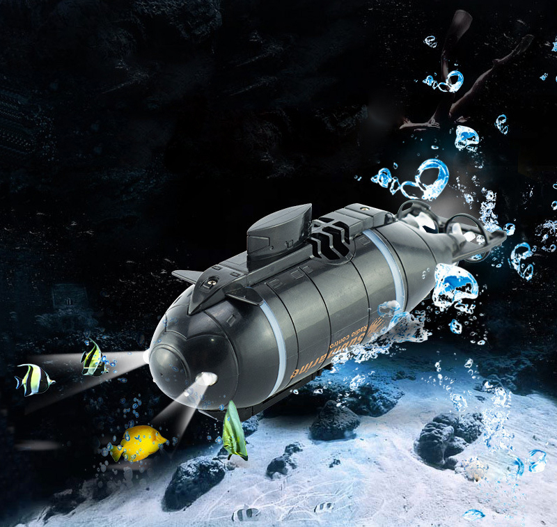 Радіокерований підводний човен Submarine може спокійно занурюватися на дно акваріума глибиною до декількох метрів, рухатися вперед і назад, а також повертати вліво та вправо. А ще човен має гарну плавучість: коли заряд батареї буде вичерпаний або капітан відпустить кнопку керування, міні-субмарина плавно виринає на поверхню. Дизайн розроблений з кільцем ущільнювача на корпусі, щоб забезпечити водонепроникність іграшки і виключити можливість протікання.