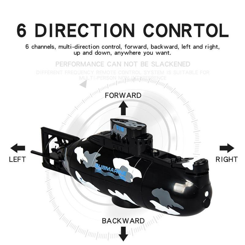 Submarine 3311M оснащена шести канальним пультом дистанційного керування, який працює на чотирьох батареях типу ААА (не входять до комплекту). Пульт захищений від води, тому ти можеш грати з підводним човном навіть у ванній або басейні. Ти можеш керувати підводним човном у всіх напрямках: вгору/вниз, вперед/назад, ліворуч/праворуч, а також робити повороти на 360 градусів. Дальність дії пульта становить до трьох метрів (у приміщенні).