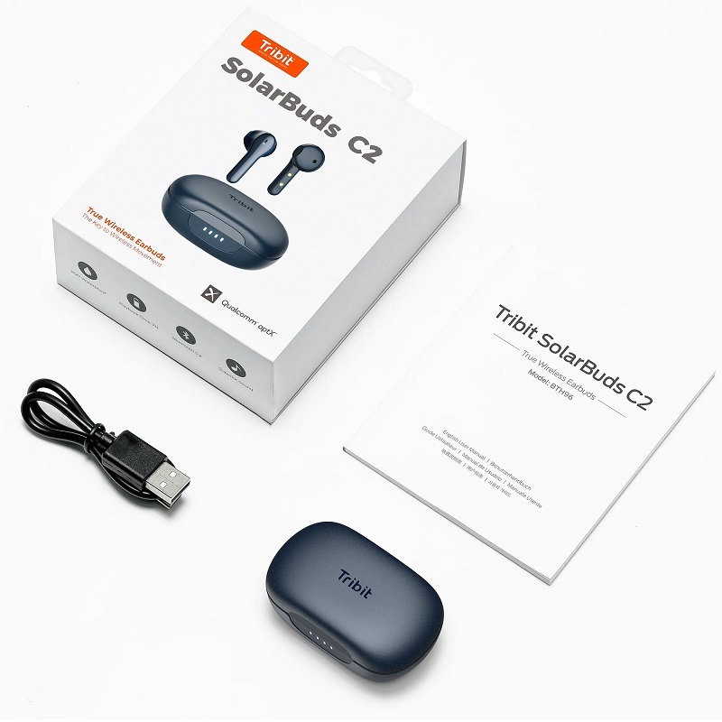 Наушники Tribit SolarBuds C2, зарядный бокс, кабель USB-USB Type-C, руководство пользователя.