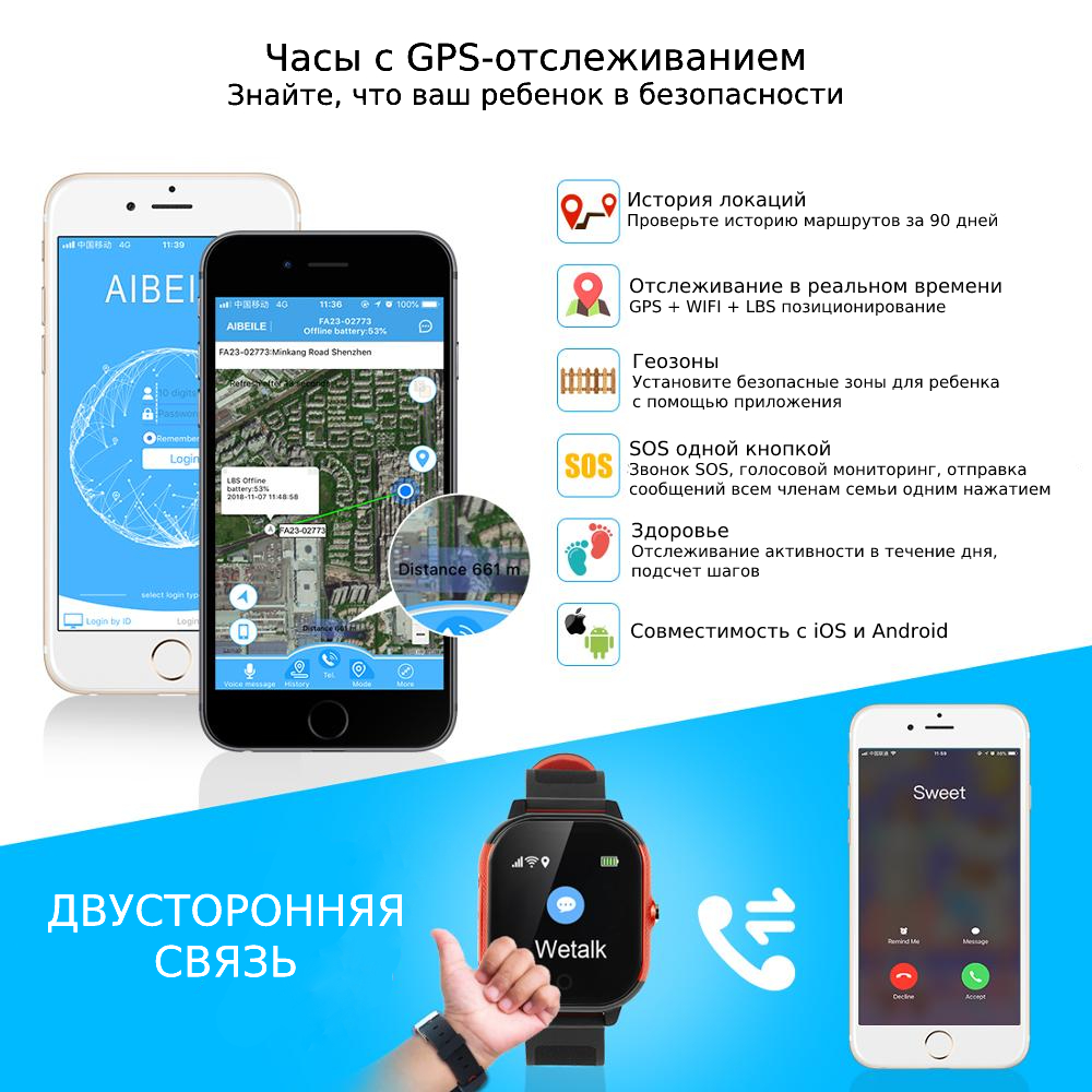 Родителям доступно отслеживание местоположения ребенка с помощью GPS, LBC WiFi. Вы также можете установить разрешенную геозону ребенка, например, чтобы он не покидал пределов жилого района и просмотреть пройденный маршрут ребенка.