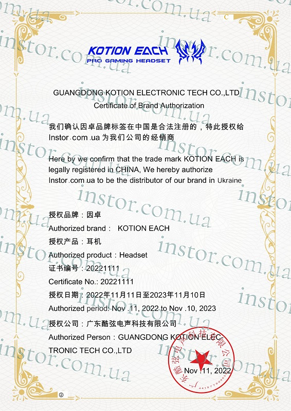 Instor является авторизированным дистрибьютором продукции Kotion Each в Украине. Мы получили соответсувующий сертификат, который подтверждает право на официальное представление этой продукции от имени производителя