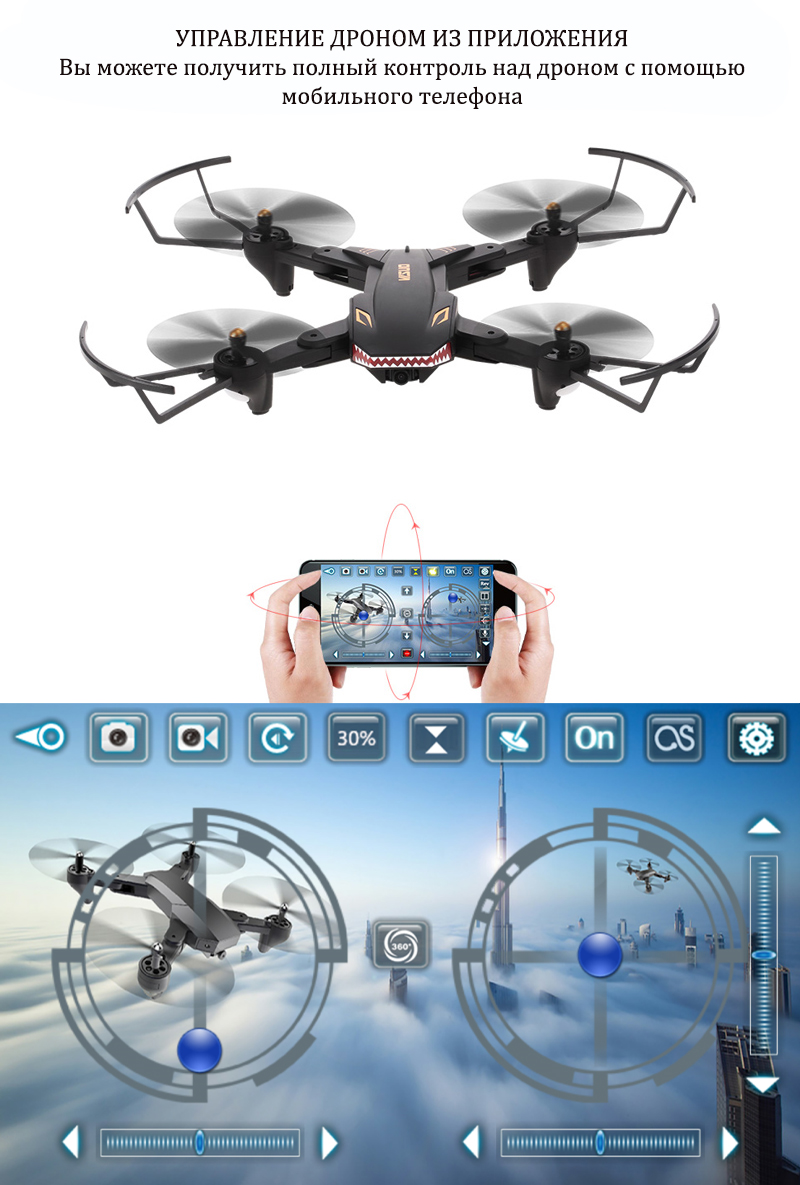 Visuo XS809S оснащен 4-канальным передатчиком, который использует использует частоту 2,4 ГГц, и 6-осевым гироскопом для легкого и стабильного управления. Чтобы использовать Wi-Fi для передачи видео в реальном времени необходимо подключение мобильного приложения XSW UFO к Wi-Fi дрона. Оно доступно для мобильных телефонов с системой IOS или Android. Кстати, пульт дистанционного управления имеет держатель для смартфона. Наслаждайтесь видом от первого лица, пока дрон летит и делает снимки с воздуха.