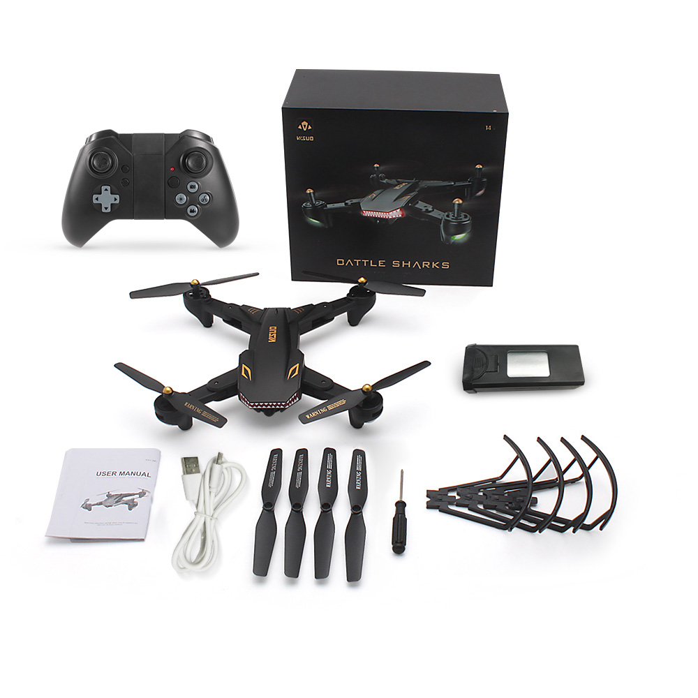 Visuo XS809S отличается компактным дизайном, и весит всего 160 грамм, поэтому его очень легко носить с собой. В разложенном состоянии он имеет размеры 32.5*32.5*6 см. В сложенном виде он размером со смартфон, который можно положить в карман или сумку. Черное покрытие корпуса и придают ему стильный вид. Передняя часть оснащена встроенным красным светодиодом с дизайном, напоминающим зубы акулы.