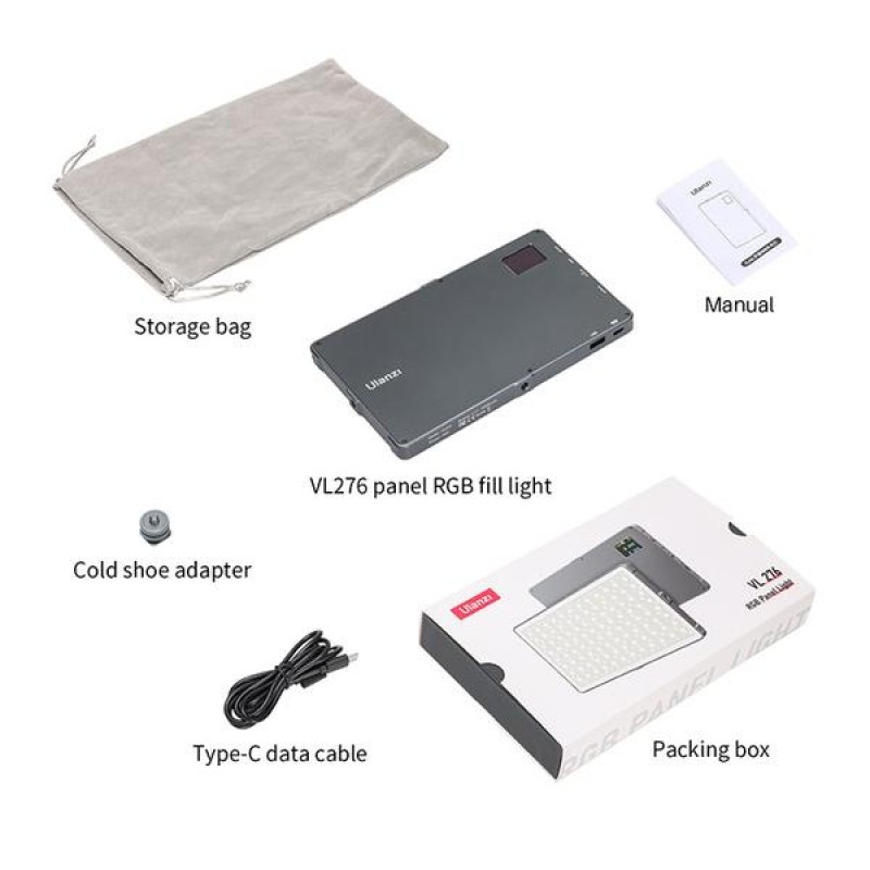В комплект поставки Ulanzi VL276 входит LED панель, адаптер холодный башмак, чехол для хранения, Type-C USB кабель.