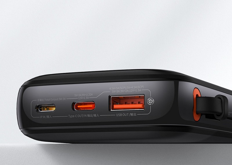 Компактный повербанк обладает большой емкость 20000мАч, мощностью зарядки 20Вт и все это вмещается в небольшой стильный корпус с размерами 75 × 123 × 33мм. Встроенный кабель, он же ремешок для транспортировки, оборудован коннектором Type-C для подключения к телефону. Baseus Qpow можно использовать для зарядки и других гаджетов подключая их к портам USB-A или Type-C, которые поддерживать многочисленные протоколы быстрой зарядки с мощностью до 20Вт.