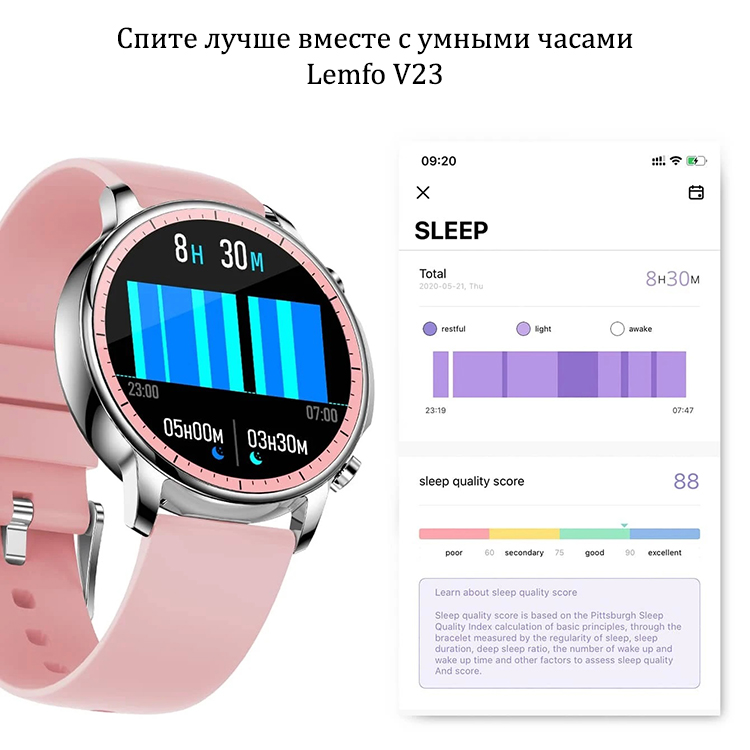 Используя Lemfo V23 вы также можете улучшить качество своего сна. Благодаря специальным функциям мониторинга умные часы собирают самые важные данные и предоставляют вам доступ к ним. Проанализируйте информацию о своих фазах сна, проверьте, как часто вы просыпаетесь ночью и узнайте, как долго вы обычно спите. Избавьтесь от вредных привычек, наслаждайтесь спокойным сном и просыпайтесь отдохнувшим!