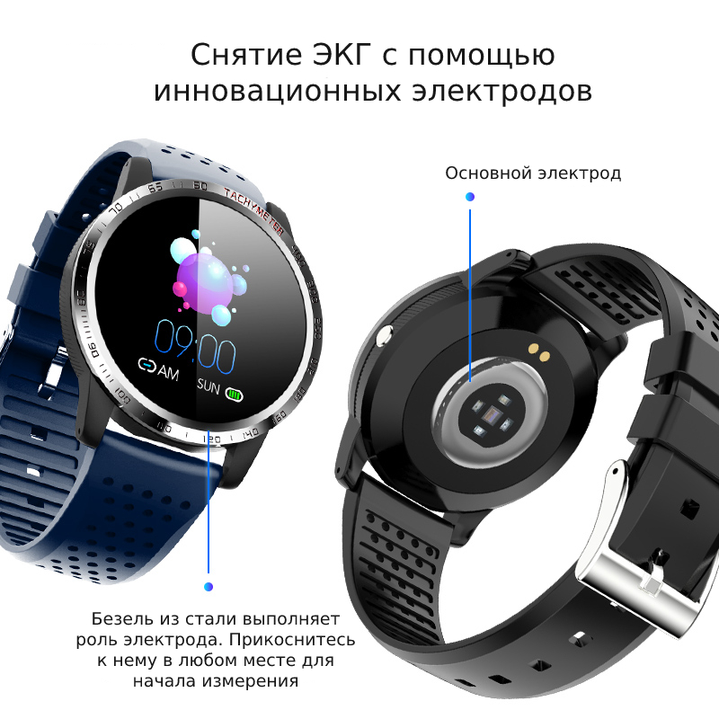 Круглый циферблат дополнен съемным ремешком, который можно выбрать на свой вкус: металлический, силиконовый или кожаный. Для отображения данных используется цветной TFT-дисплей с диаметром 1,3 дюйма. Окно оптического датчика с внутренней стороны дополнено металлической вставкой, которая выполняет роль электрода. На лицевой стороне имеется металлический безель, который замыкает цепь при снятии ЭКГ. Коснитесь его в любом месте во время измерения.