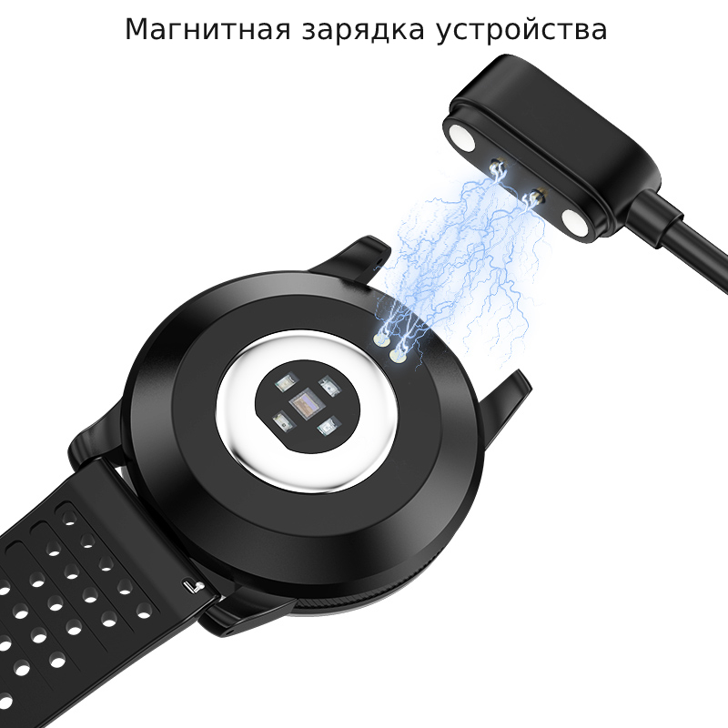 Смарт-часы Lemfo W3 используют магнитную зарядку. Ее легко подключить в одно касание: с тыльной стороны устройства вы увидите контакты 2-pin, а в комплекте имеется зарядка с подходящим разъемом.
