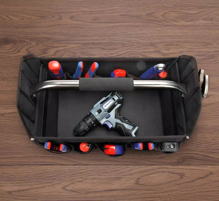 У пошуках органайзера чи сумки для інструментів? Ми знаємо, де купити відмінну модель за адекватною вартістю з доставкою до всіх міст України. Складна сумка для інструментів Workpro WP281011 зроблена повністю із міцного поліестеру 600D. Ця сумка є відкритою, розміри становлять 410×235×270 мм. Як усередині, так і зовні сумки розміщується велика кількість різних за розміром кишень для зберігання робочого інструменту.