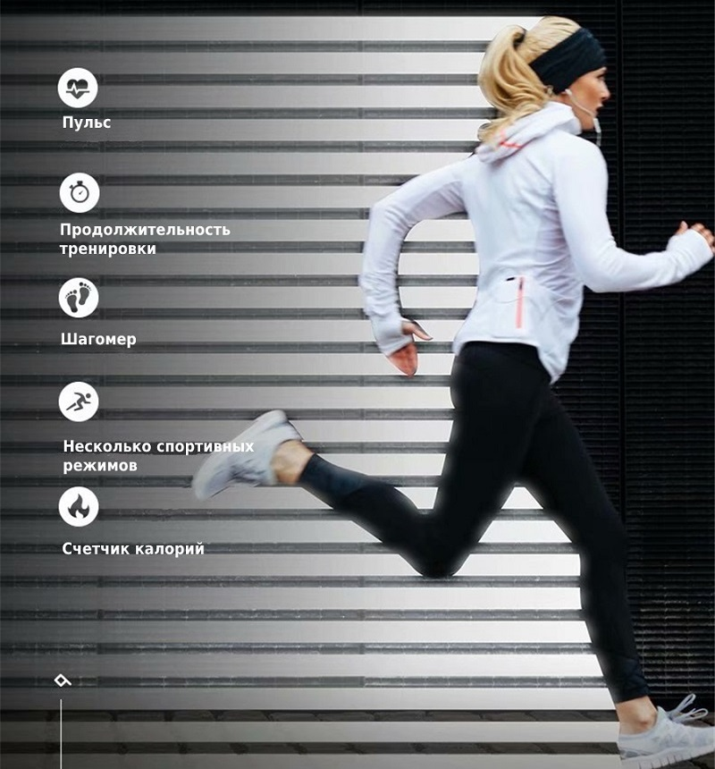 Акселерометр, Лічильник калорій, Крокомір, Пульсометр, Вміст кисню в крові, Тонометр, Гіроскоп