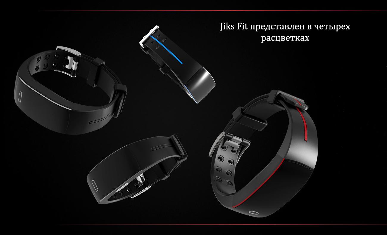 У лінійці Jiks Fit представлено чотири можливих забарвлення - класичний чорний, зі вставками червоного і синього на ремінці, а також синьо-червоний ремінець для найяскравіших особистостей. Зручний регульований ремінець підлаштується під будь-який обсяг руки.