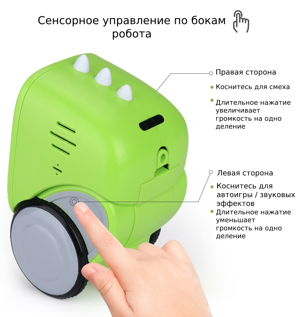 Над кожним колесом є сенсорна панель, що відповідає за різні можливості. Торкніться правої панелі, щоб робот розсміявся і його обличчя змінилося на радісне, довге натискання збільшує гучність звуку на 1 пункт. Торкання лівої панелі включає динамічні звукові ефекти, довге натискання – зменшує гучність на 1 пункт.