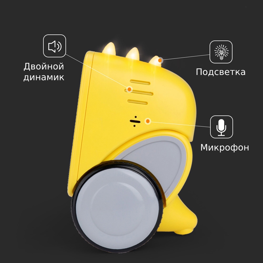 Яскравий дизайн у жовтому та зеленому кольорі точно сподобається будь-якому непосиді. Є невеликі шипи на спині, як у динозаврів, але так як це інтерактивна іграшка, то вони можуть ще й світитися в такт музиці. Обличчя робота замінює табло, на якому відображаються емоції: радість, сум, подив, сміх. Прямо під ним є кнопка запису секретних повідомлень. Довге утримання кнопки включає запис.